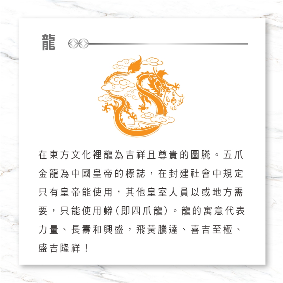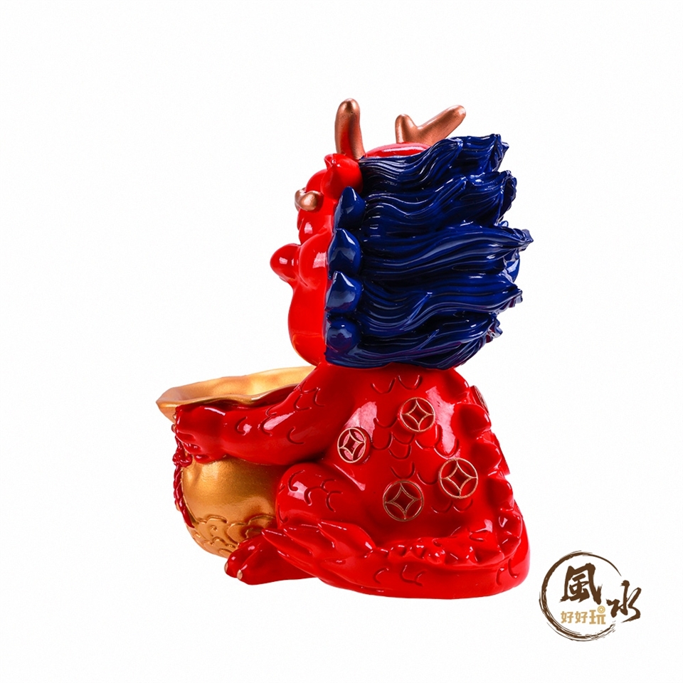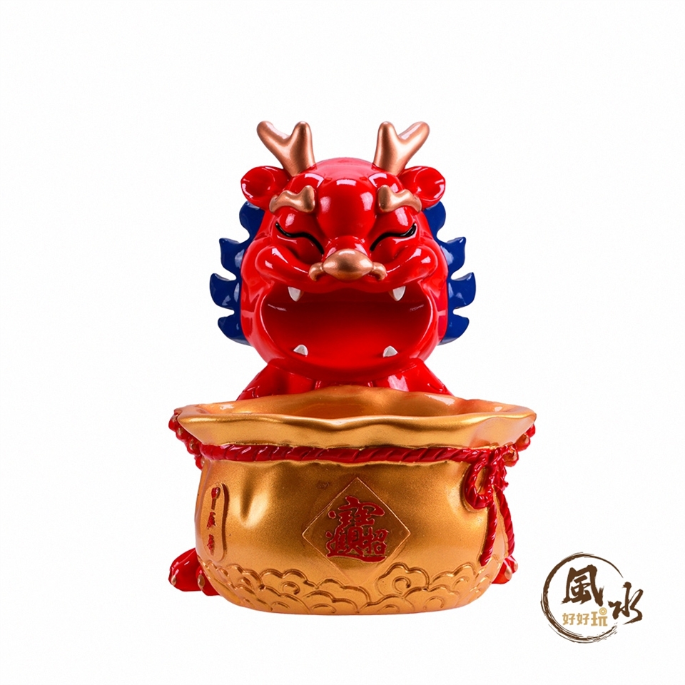 龍本身代表著尊榮與吉祥的含意,錢龍全身為赤紅色,代表著火行,身背錢幣,手捧福袋,意喻著招財守財。