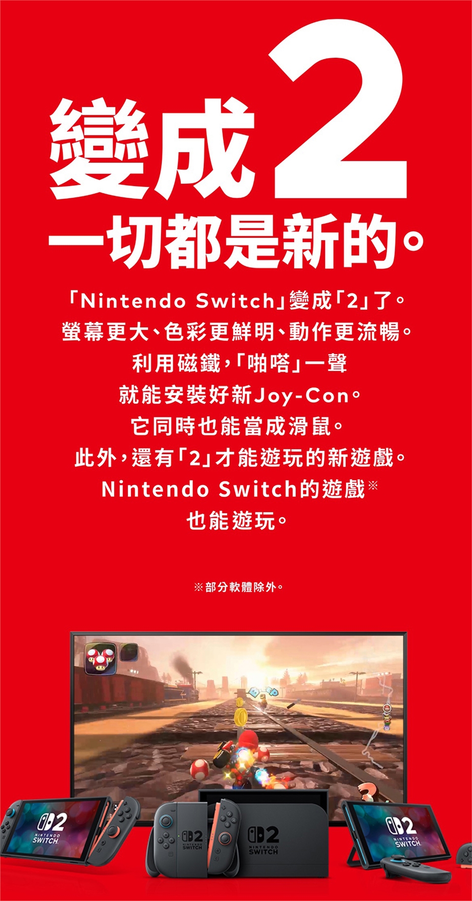 | 注意事項 | ※網頁圖片為商品示意圖,屆時將以實體商品為準。 「NS2單主機」商品可能為「單機包裝」或「拆售版單機」,兩種包裝將隨機出貨,恕不挑款。 ※主機一樣憑發票或購買證明,非人為因素故障享一年保固。 |