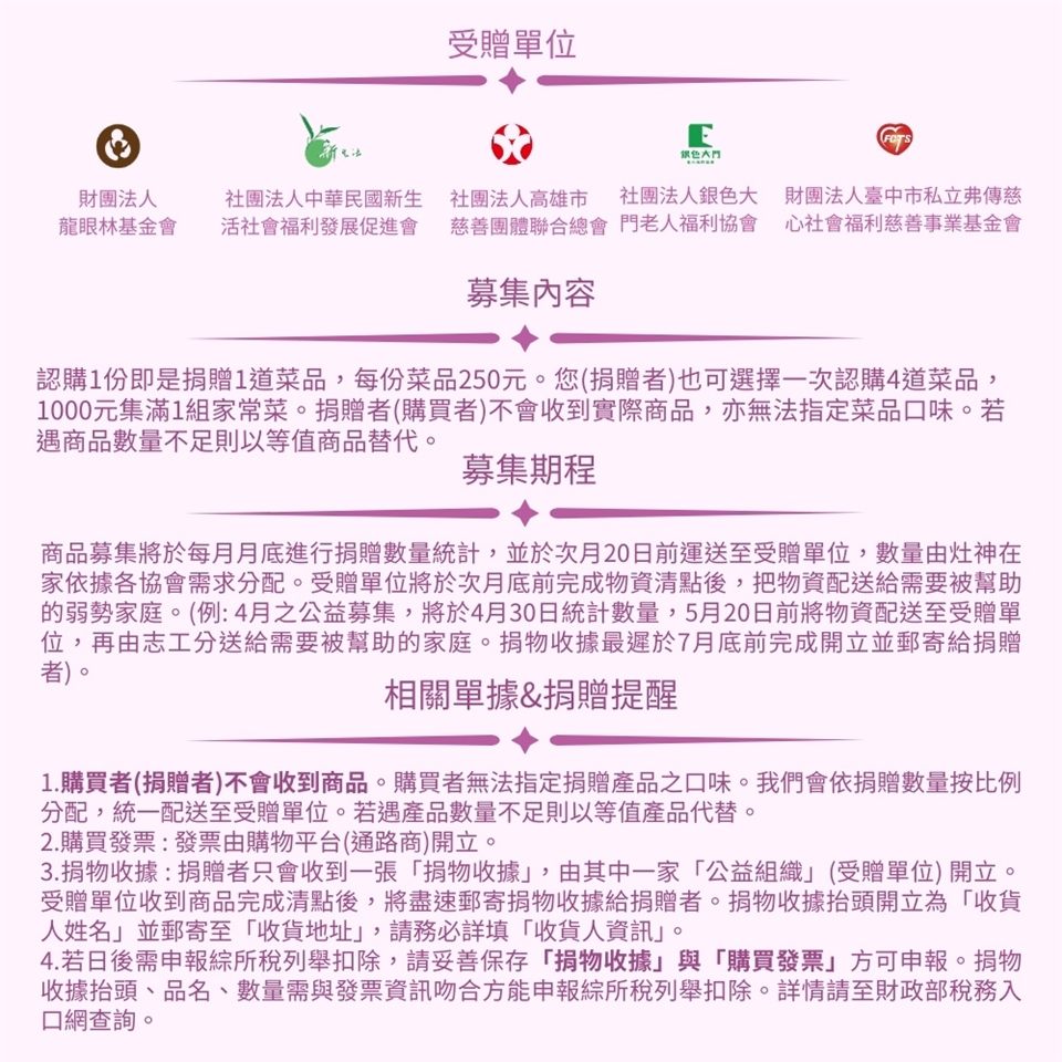 認購1份即是捐贈1道菜品,每份菜品250元。您(捐贈者)也可選擇一次認購4道菜品,1000元集滿1組家常菜。捐贈者(購買者)不會收到實際商品,亦無法指定菜品口味。若遇商品數量不足則以等值商品替代。