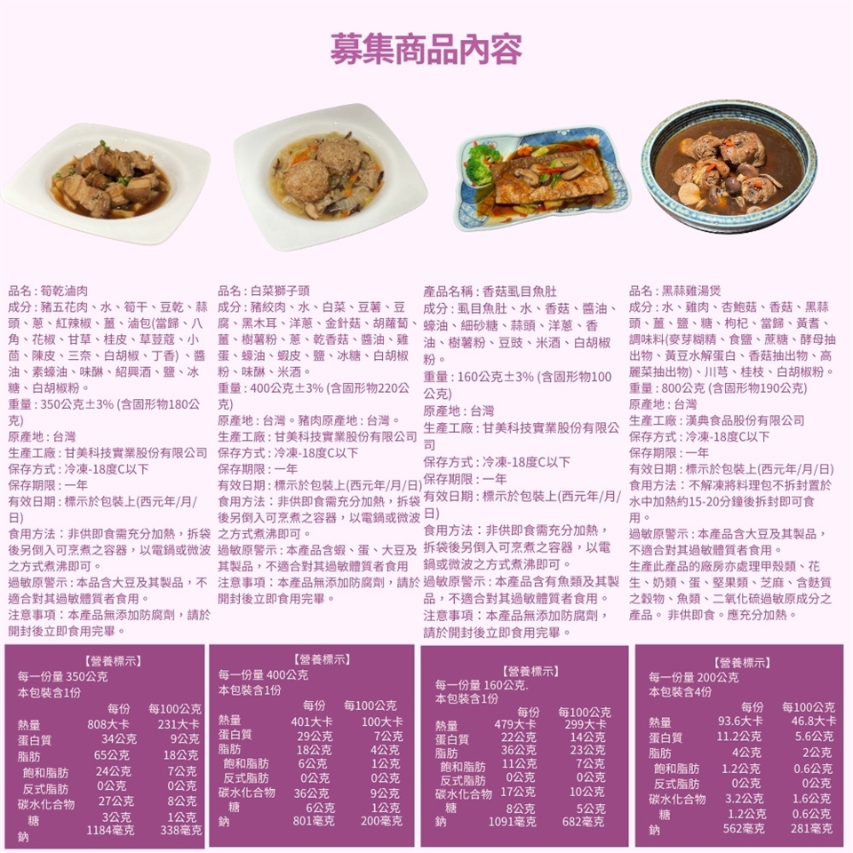 香菇虱目魚肚 160公克(含固形物100公克)、古早味筍乾滷肉 350公克(含固形物180公克)、 白菜獅子頭 400公克(含固形物220公克)、黑蒜雞湯煲800公克(含固形物190公克)消費者(捐贈者)恕無法指定捐贈菜品之品項。我方會依捐贈數量按比例分配菜品,彙整總數量後統一配送至受贈單位。若遇產品數量不足則以等值產品替代。