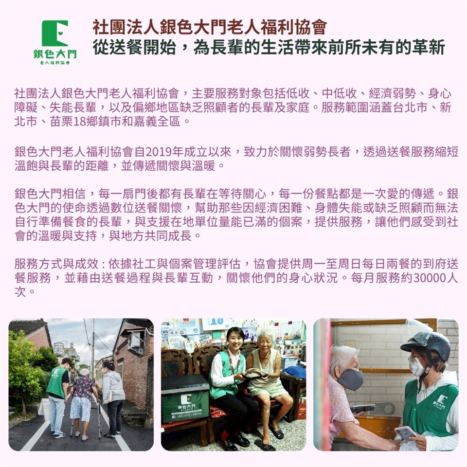 銀色大門老人福利協會自2019年成立以來,致力於關懷弱勢長者,透過送餐服務縮短溫飽與長輩的距離,並傳遞關懷與溫暖。