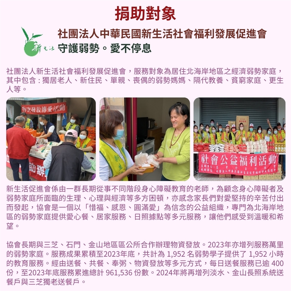 受贈單位一 : 社團法人新生活社會福利發展促進會