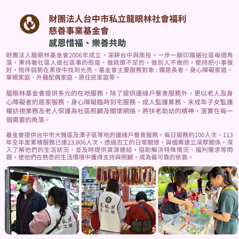 財團法人龍眼林基金會2006年成立,深耕台中與南投。一步一腳印踏遍社區每個角落,秉持著社區人做社區事的態度,做政策不足的,做別人不做的,堅持把小事做好,陪伴弱勢在黑夜中找到光亮。基金會主要服務對象 : 獨居長者、身心障礙家庭、單親家庭、外籍配偶家庭、原住民家庭等。