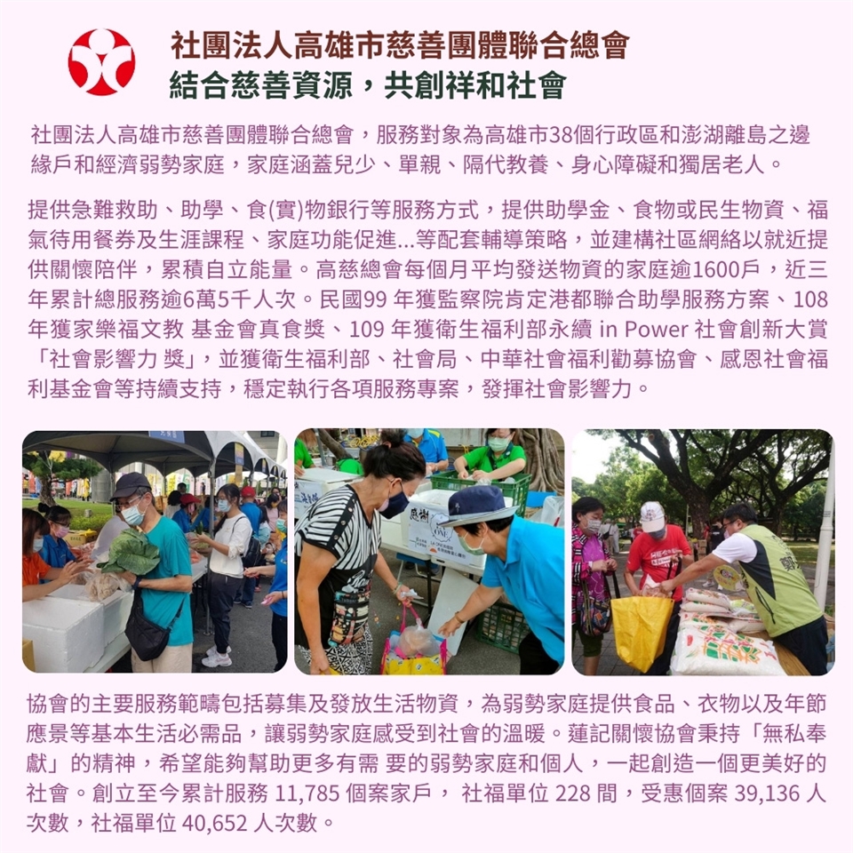 社團法人高雄市慈善團體聯合總會 ( 簡稱 : 高慈總 ) 成立於民國 72  5  22 日,長期服務經濟弱勢家庭,扎根在高雄市,辦理高雄市急難救助金平台、高雄市實物銀行第一區、高雄市阿福食物銀行、港都聯合助學服務方案及經濟弱勢家庭培力工作,主要服務對象為高雄市38個行政區及澎湖之經濟弱勢家庭,尤其以無法取得政府補助之邊緣戶為優先照顧對象,家庭涵蓋兒童、少年、單親、隔代教養、身心障礙和老人等。