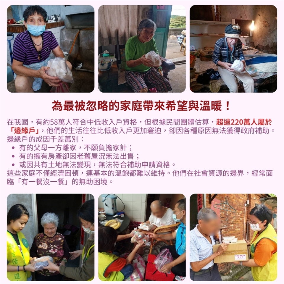 在我國,有約58萬人符合中低收入戶資格,但根據民間團體估算,超過220萬人屬於「邊緣戶」,他們的生活往往比低收入戶更加窘迫,卻因各種原因無法獲得政府補助。