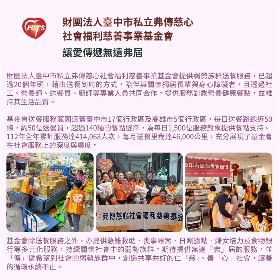 財團法人臺中市私立弗傳慈心社會福利慈善事業基金會提供弱勢族群送餐服務,已超過20個年頭,藉由送餐到府的方式,陪伴與關懷獨居長輩與身心障礙者,且透過社工、營養師、送餐員、廚師等專業人員共同合作,提供服務對象營養健康餐點,並維持其生活品質。