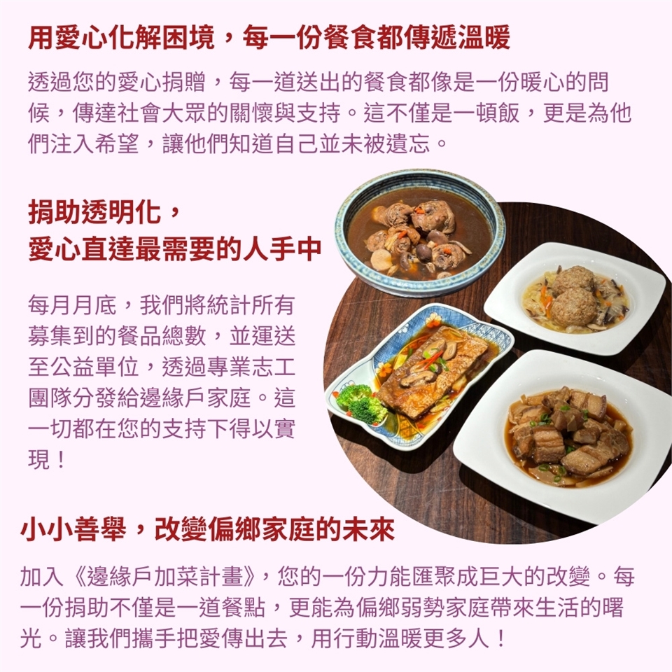 加入《邊緣戶加菜計畫》,您的一份力能匯聚成巨大的改變。每一份捐助不僅是一道餐點,更能為偏鄉弱勢家庭帶來生活的曙光。讓我們攜手把愛傳出去,用行動溫暖更多人!
