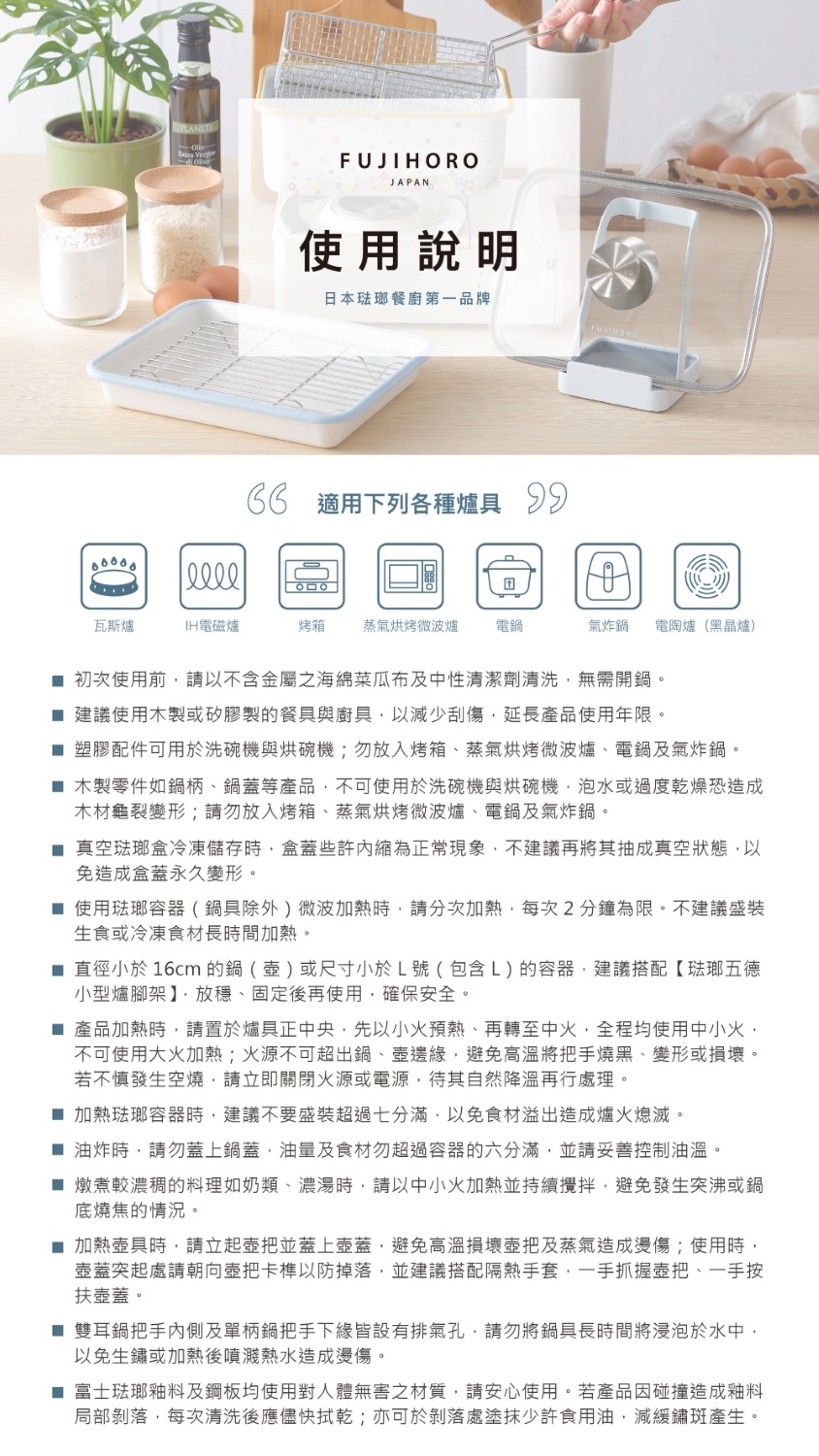 琺瑯產品適用各種直火爐具,包含瓦斯爐、IH電磁爐、電熱爐、黑晶爐、電陶爐、紅外線爐等(IH電磁爐感應線圈尺寸不一,購買前請先確認府上 IH電磁爐感應尺寸)