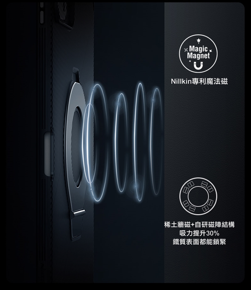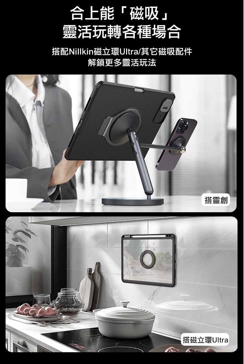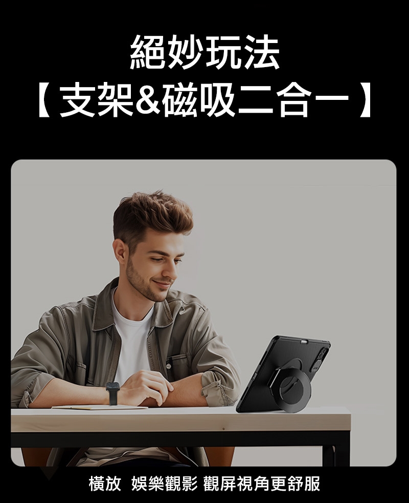 .創新磁吸支架設計,兼顧平板支撐與磁吸功能