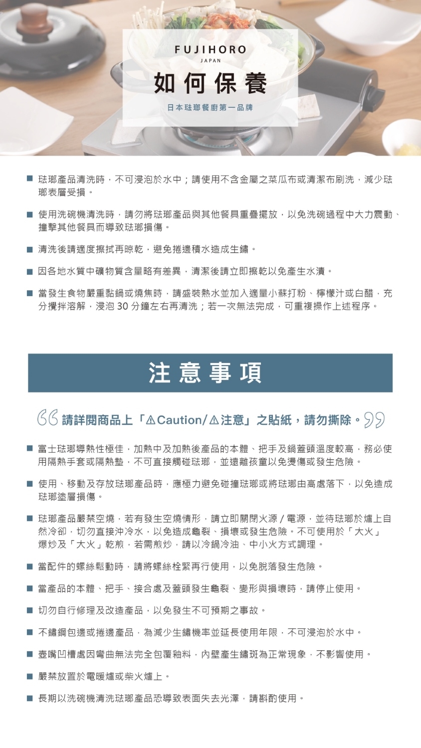 ‧本產品加熱使用後請待冷卻後再清洗,避免熱脹冷縮導致鍋身釉料剝落。