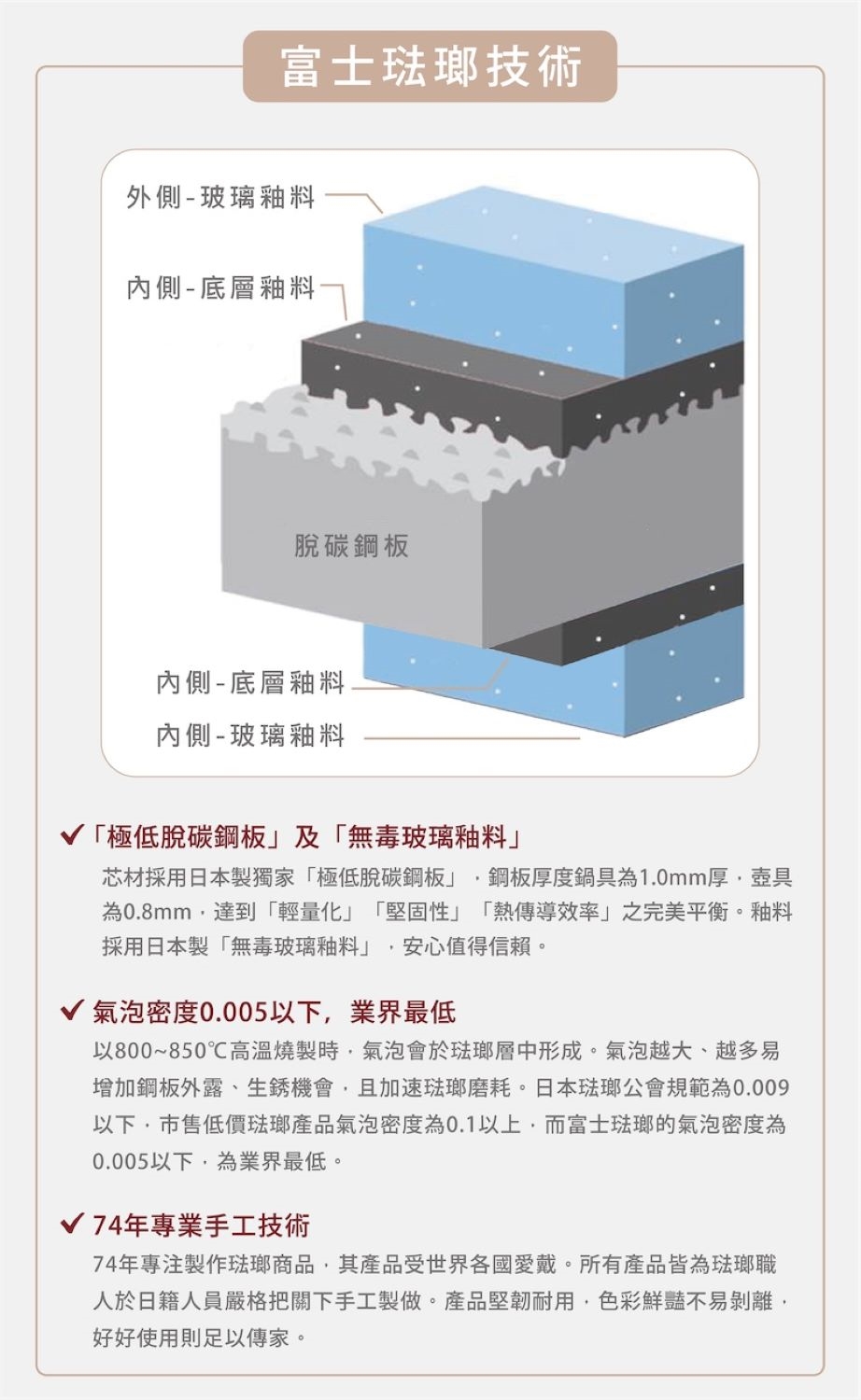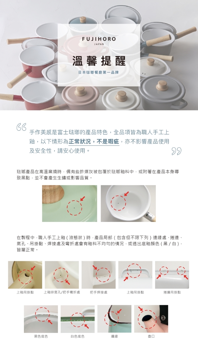 ‧琺瑯產品為琺瑯職人手作,把手內側黑點及小孔為上釉過程中的氣孔或吊掛點,製程中邊緣無法均勻上色,透出底層黑色琺瑯為無