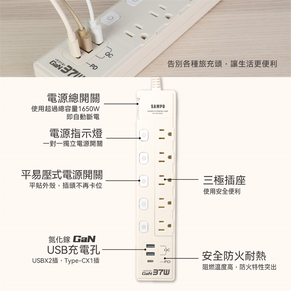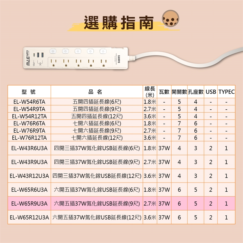 | SAMPO 六開五插37W氮化鎵USB延長線(9尺) EL-W65R9U3A |