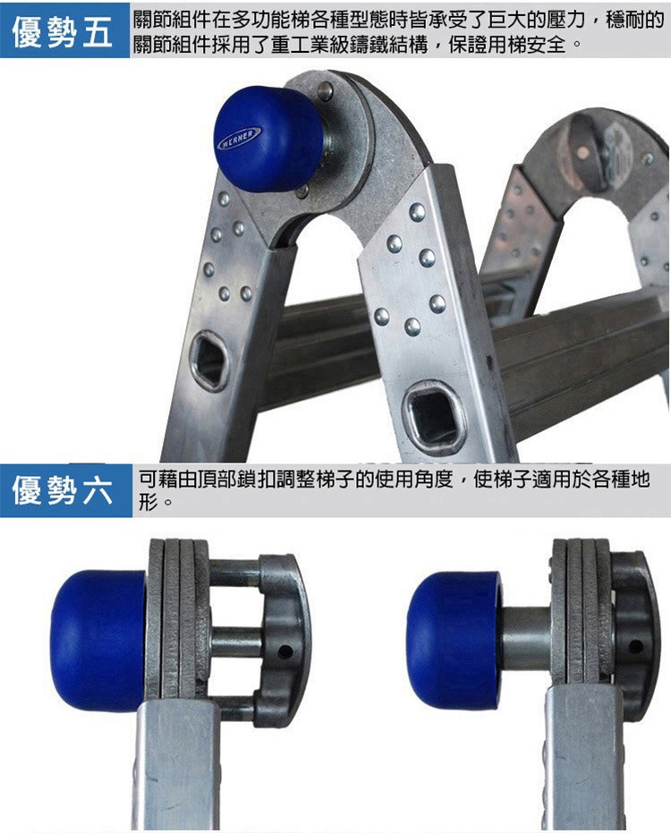 4種變換:雙側人字梯、伸縮式延伸梯、階梯式雙側梯、工作平台。