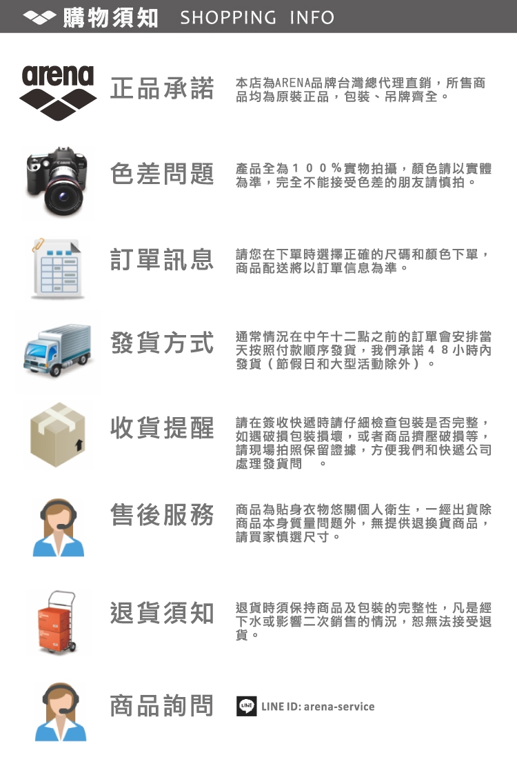 本店為ARENA品牌台灣總代理直銷,所售商品均為原裝正品,包裝、吊牌齊全。