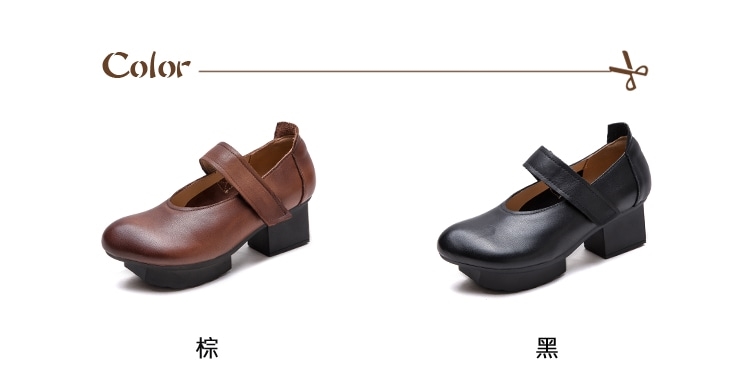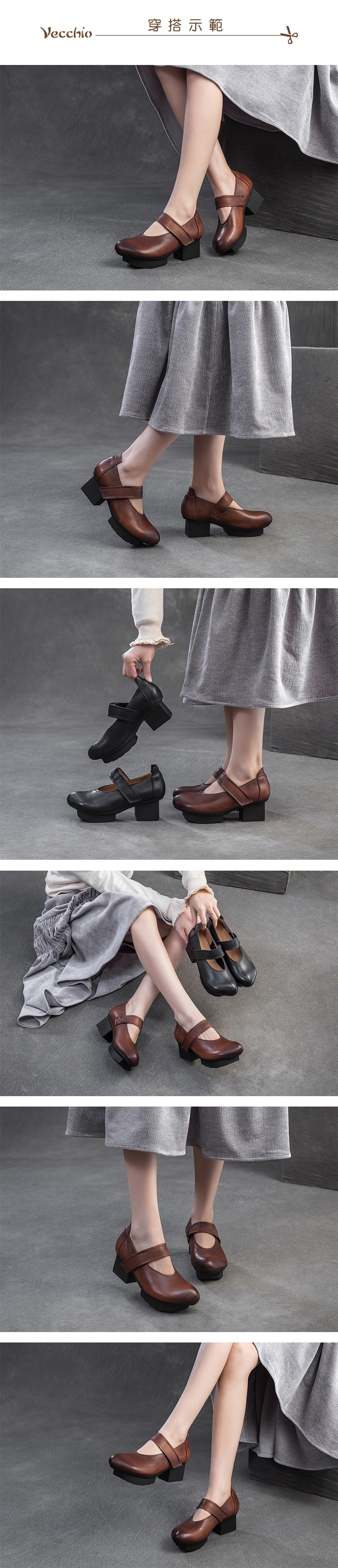 【VECCHIO】全真皮魔鬼粘一字帶高跟鞋/全真皮頭層牛皮魔鬼粘一字帶復古傳統設計高跟鞋 女鞋 棕