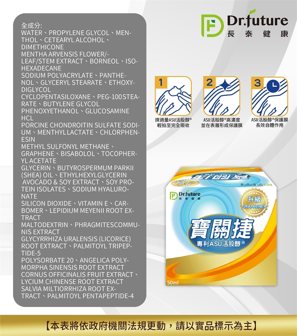 贈品:Dr.future長泰健康寶關捷專利ASU活股醇®石墨烯膏(50ml/瓶)*1(此商品開放體驗數量,退貨時需退回;其餘商品須保持包裝完整,以免影響退換貨權益)