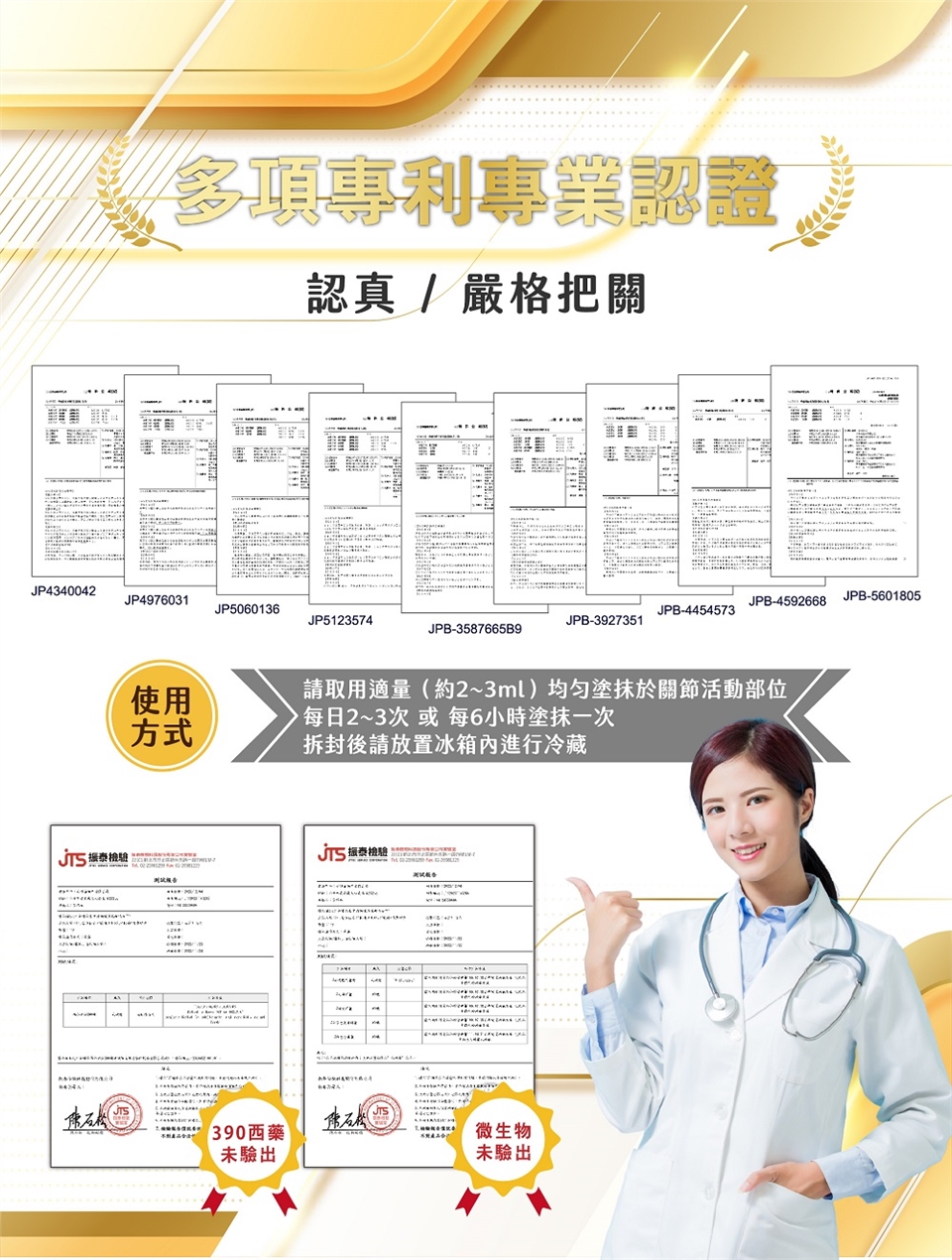主商品:請取用適量(約2~3ml)均勻輕拍於關節活動部位,每日2~3次。