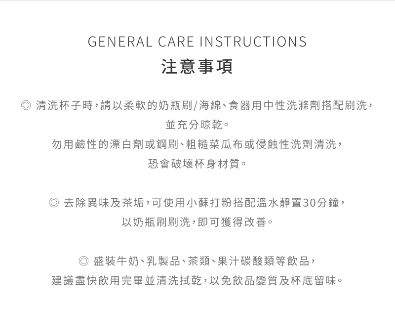 •盛裝牛奶、果汁、咖啡、乳酸類等飲品,建議盡早飲用完畢並清洗拭乾,長保陶瓷孔隙的清潔度。
