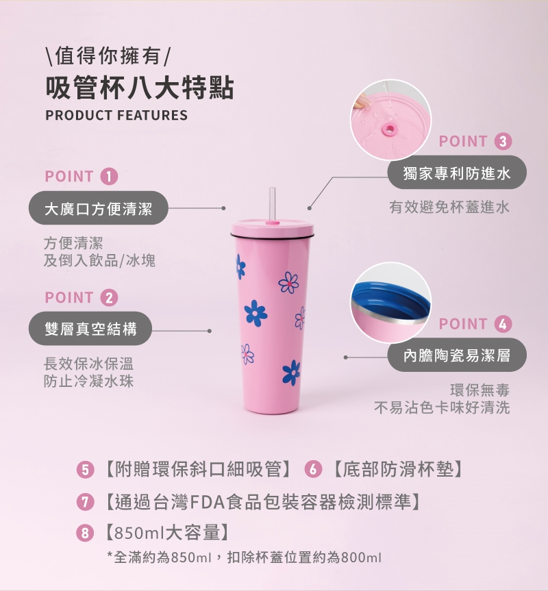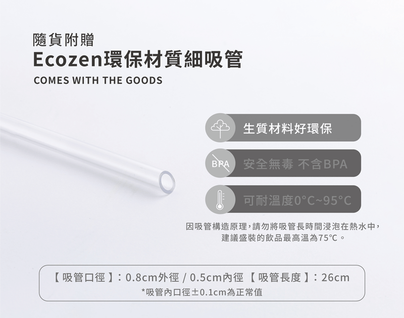 ⚠️因吸管構造原理,請勿將吸管長時間浸泡在熱水中,建議盛裝的飲品最高溫為75°C。