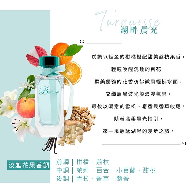 前調以輕盈的柑橘搭配甜美荔枝果香,輕輕喚醒沉睡的百花,柔美優雅的花香彷彿微風輕拂水面,交織層層波光般浪漫氣息。最後以暖意的雪松、麝香與香草收尾,隨著溫柔晨光指引,來一場靜謐湖畔的漫步之旅。