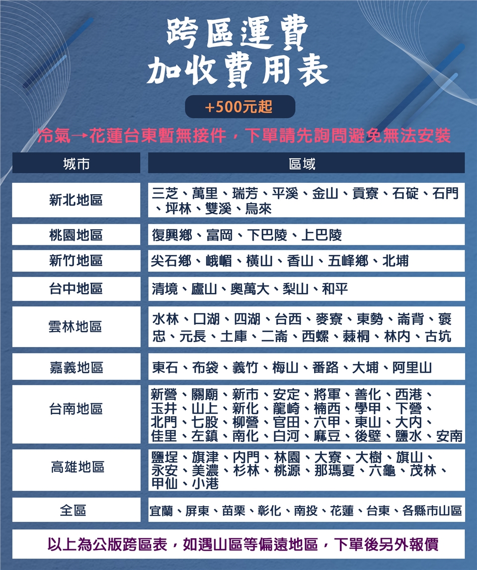 ※本報價採用【標準安裝】定義為原廠箱子內隨貨配件為基準(其餘所需材料以下表收費為準)