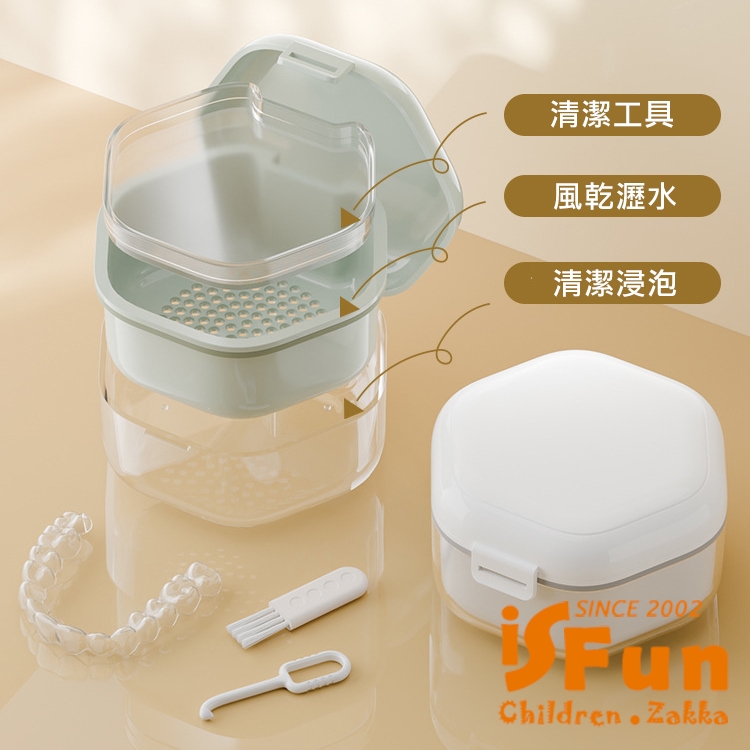 內部三層設計,可收納清潔小工具,浸泡牙套與瀝水功能。