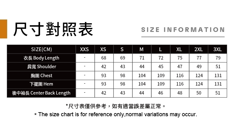 ‧建議消費者穿著對照尺寸: