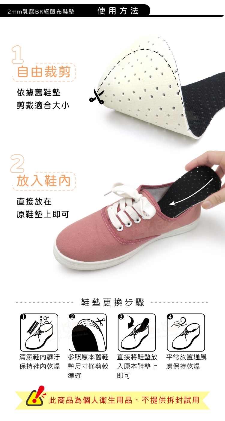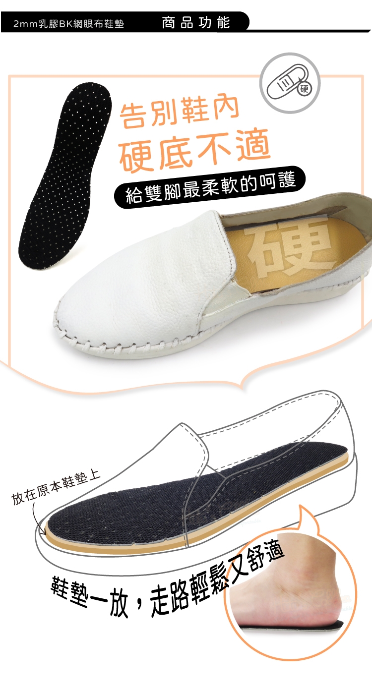 直接將2mm乳膠BK布鞋墊放於原本鞋墊上面