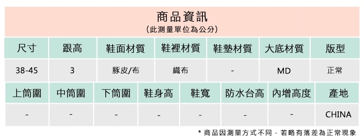 2.鞋類商品依功能及用途之不同,鞋底各有其止滑係數之個別不同,使用鞋類商品請用於正常平坦之路面,非雨鞋或雨靴類商品,請避免穿著於下雨濕滑路面上行走。