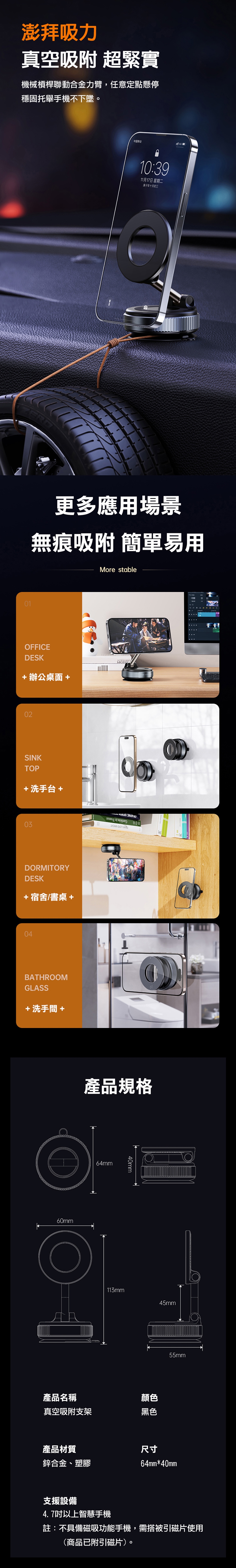 4.多場景使用,不只車用,洗臉台、廚房、辦公桌等 皆可吸附。