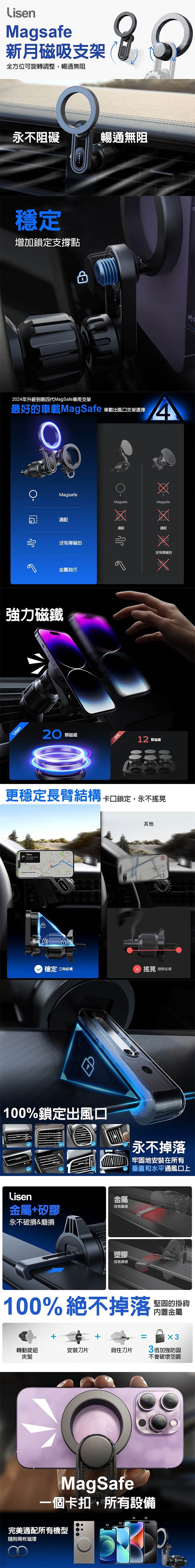 【Lisen】360度旋轉MagSafe 新月磁吸車用手機支架(內附磁吸環)