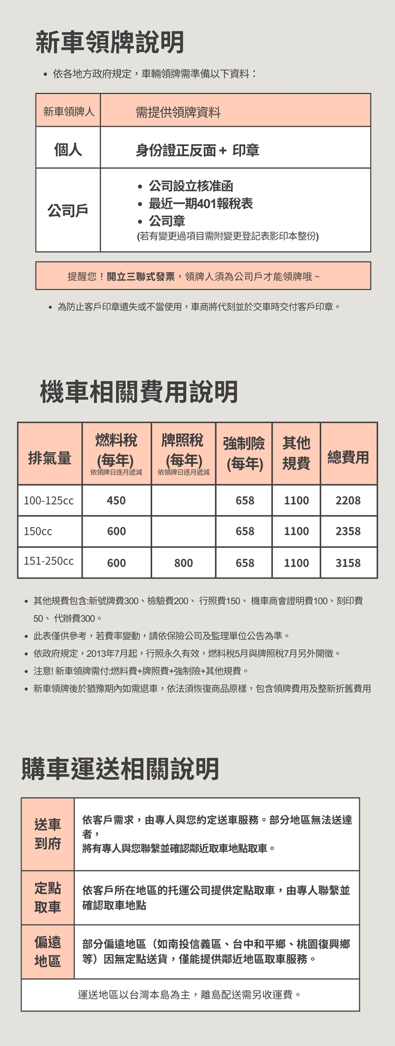 流程問題 :br.須自付燃料稅、領牌費、強制險費用等。br.車牌號碼恕不提供選號(除自費選號)。br.購買後將有專人為您說明證件寄送及辦、領車等流程問題。br.客需提供辦理相關資料寄至廠商處,以便辦理領牌作業br.廠商收到資料及費用後,統一由光陽機車供貨商代客在新北市辦理領牌作業。br.領牌完成後,由出貨廠商與您連絡約定送貨時間。br.一經領牌,恕無法辦理退貨,購買前請詳加確認您的需求。 br.以您繳交費用及證件齊全後算起,交車時間約為7日工作天左右(除開學季,或天災,不可抗命之因素等等可能延長交車時間,請客見諒)br.宅配到府僅限台灣本島宅配到府,部分偏遠縣市(花蓮、南投)和山區採定點取車方式。