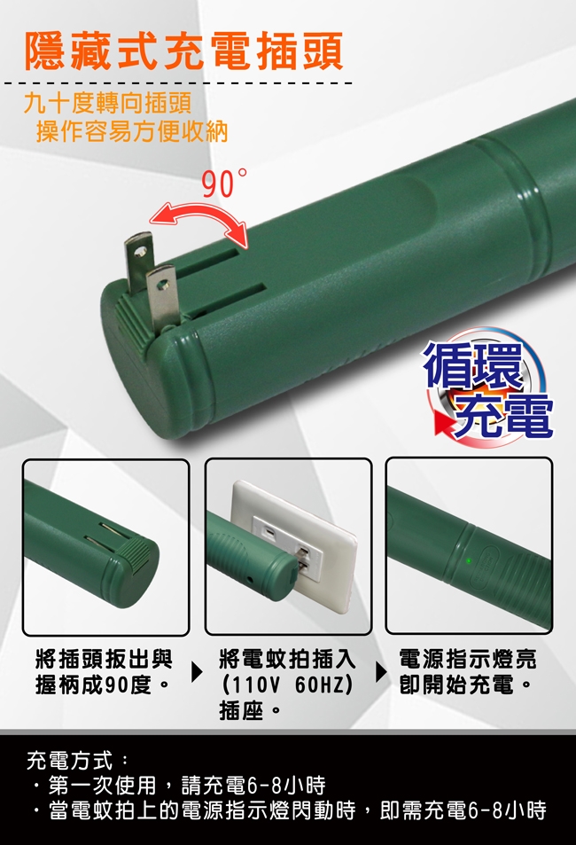 ‧ 當電蚊拍上的電源指示燈閃動時,即需充電6-8小時