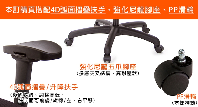 本訂購頁規格:4D弧面升降折疊扶手、尼龍腳座、PP滑輪