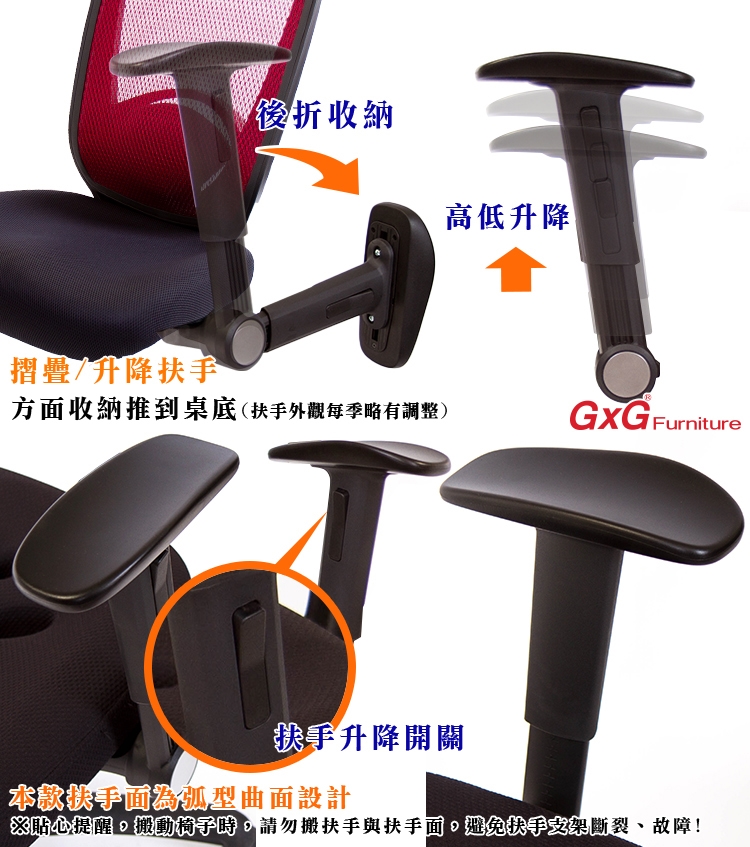 本款搭配HR-005扶手,扶手表面有軟膠材質,平時手肘倚靠,增添舒適輕鬆感,可調整扶手高低,或向後折疊收納,方便推入桌下不佔空間。