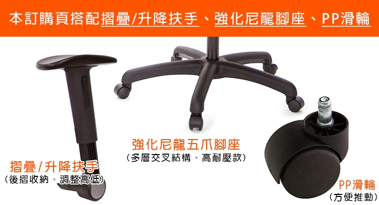 本訂購頁規格:升降折疊扶手、尼龍腳座、PP滑輪
