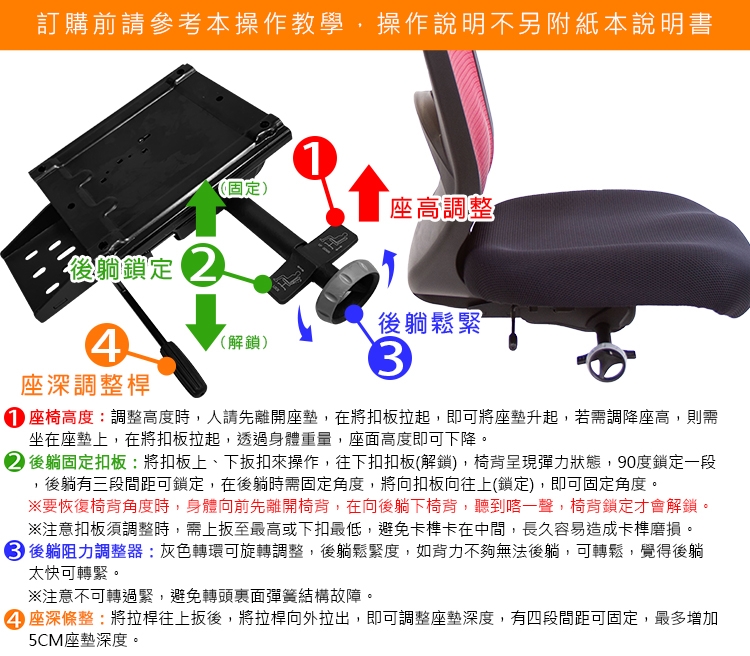 01.座椅高度︰調整高度時,人請先離開座墊,在將扣板拉起,即可將座墊升起,若需調降座高,則需坐在座墊上,在將扣板拉起,透過身體重量,座面高度即可下降。