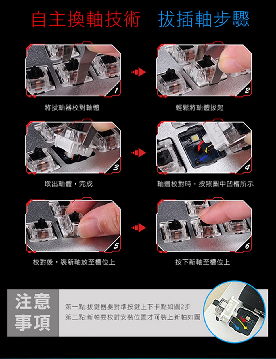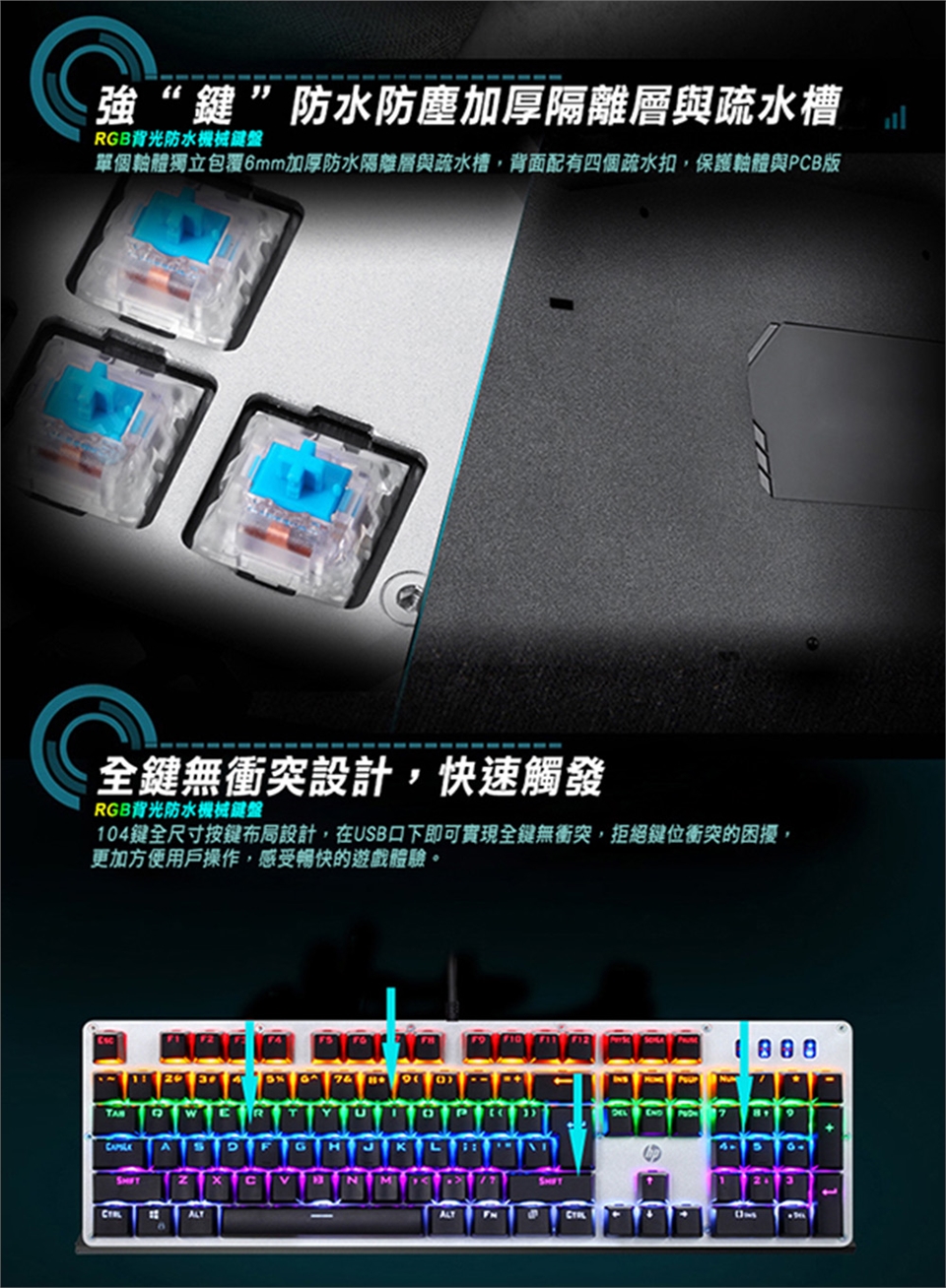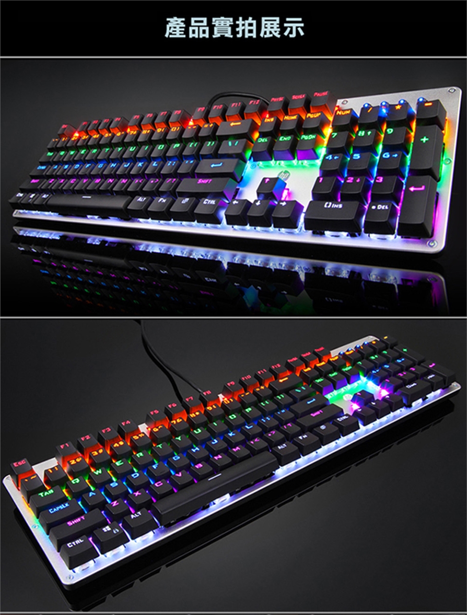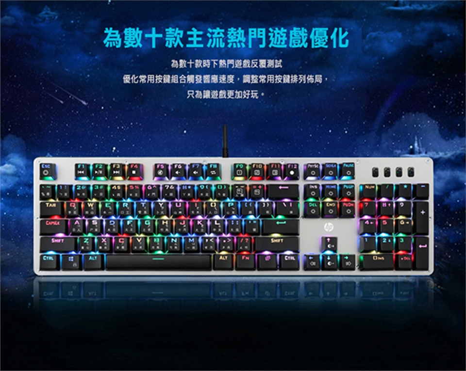 時尚外觀設計,一體成形金屬面板,永不生銹,耐刮傷。鍵帽採用雙色注塑工藝。採用機械軸設計,6000萬次按鍵壽命,經久耐用,手感極佳。支援6鍵與N鍵模式自選。具有智慧休眠模式: 主機進入休眠或待機狀態,背光功能關閉,主機啟動後恢復先前設定模式。一鍵還原功能:長按FN+ESC 3秒,鍵盤恢復到出廠設定。鍵盤人性化設計,與Fn配合增加一系列常用快捷功能按鍵。