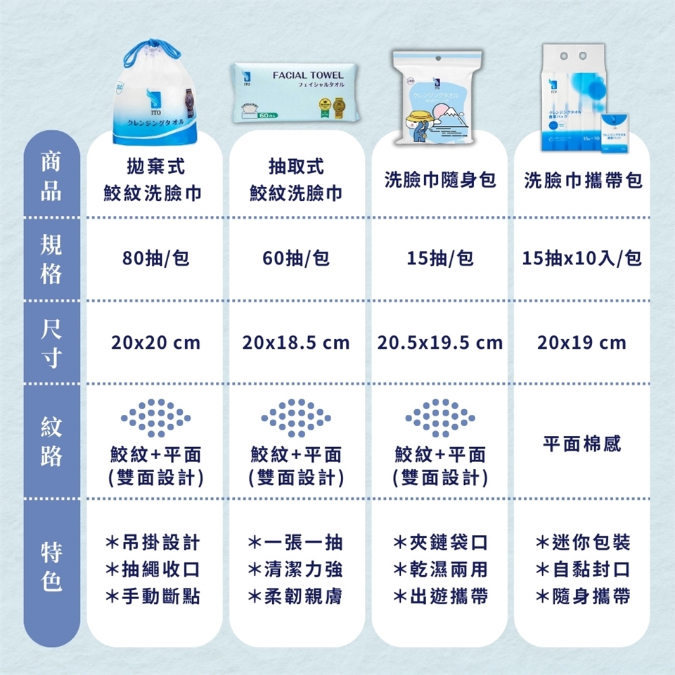 ●獨家「鮫小紋織法」+「雙面壓紋設計」,清除污垢或擦拭肌膚時,較不易產生絨毛,可避免擦臉時沾黏於臉上。