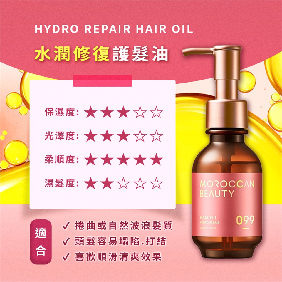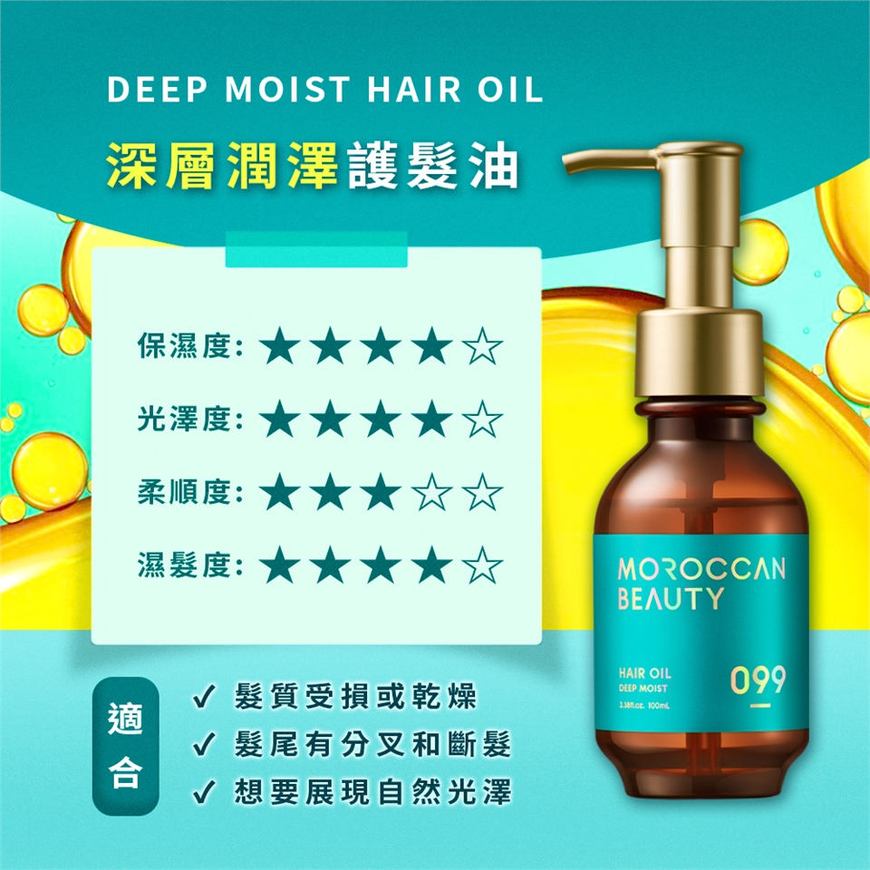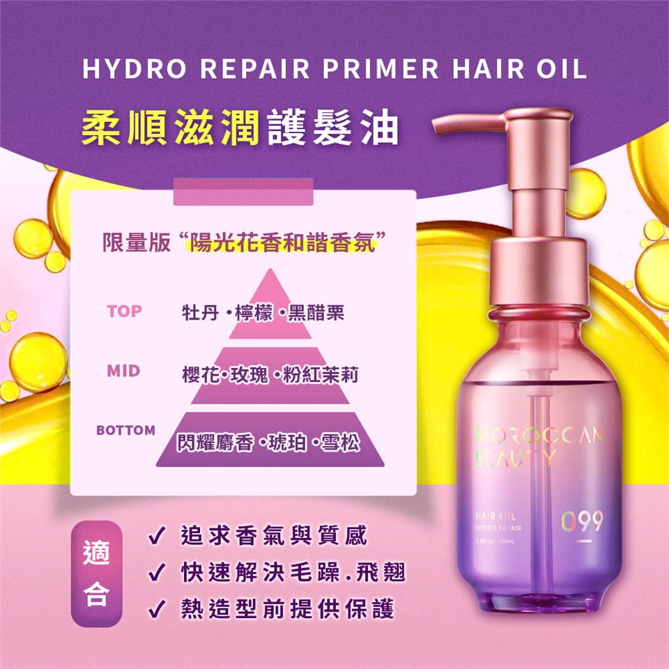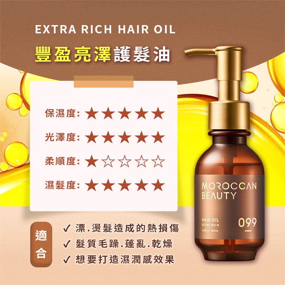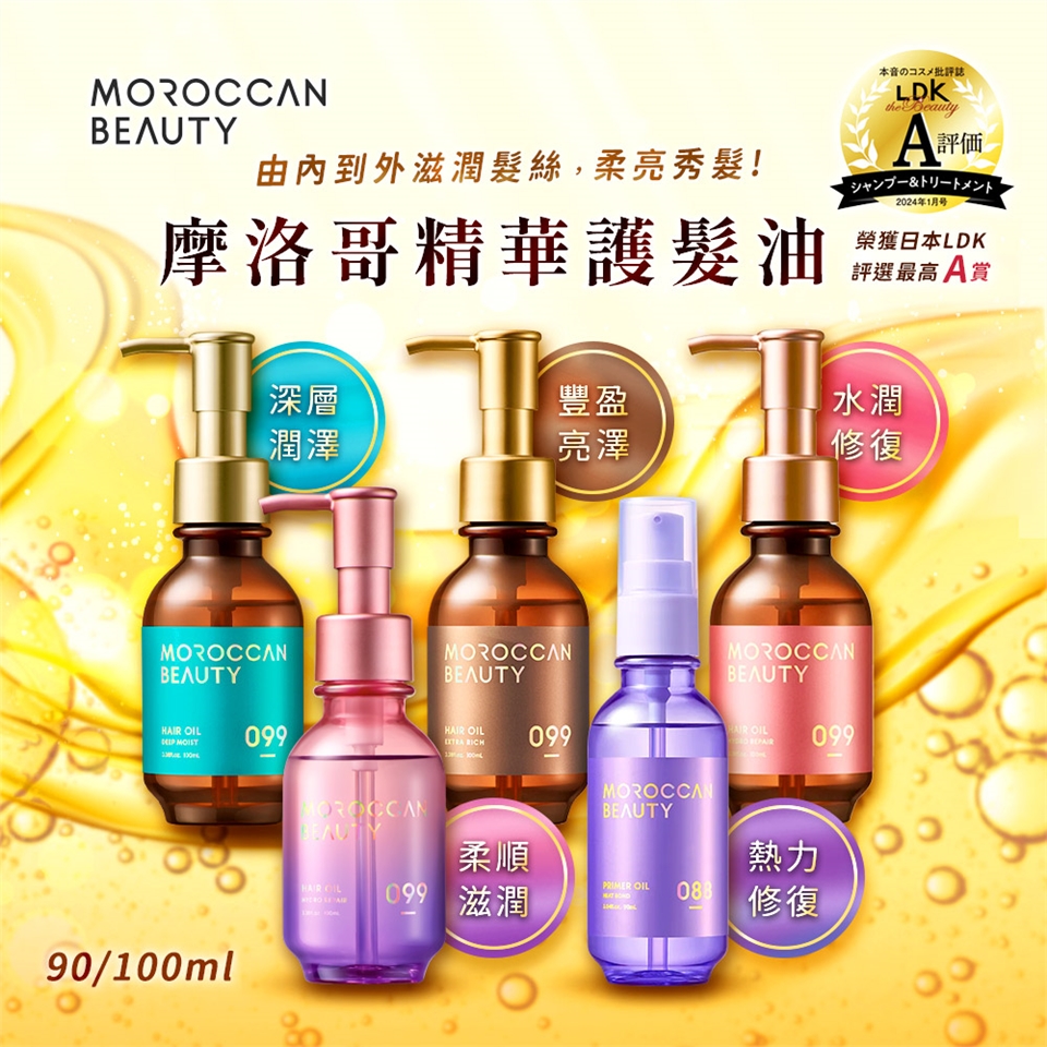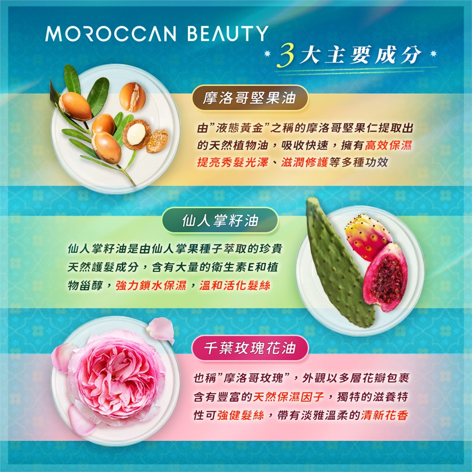 ●富含油脂的「摩洛哥光澤配方」,徹底抵禦高溫、紫外線、色素、乾燥造成的四大傷害。