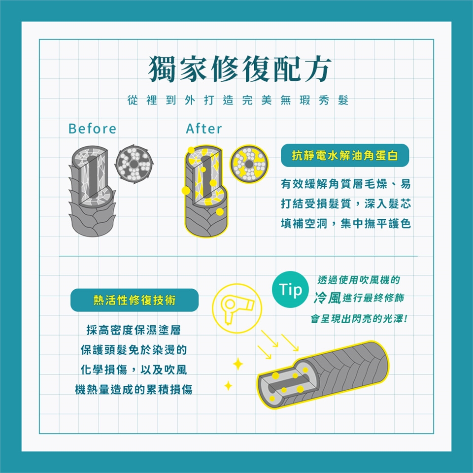 ●熱活性修復技術,採高密度保濕塗層,保護頭髮免於染燙的化學損傷,以及吹風機熱量造成的累積損傷。