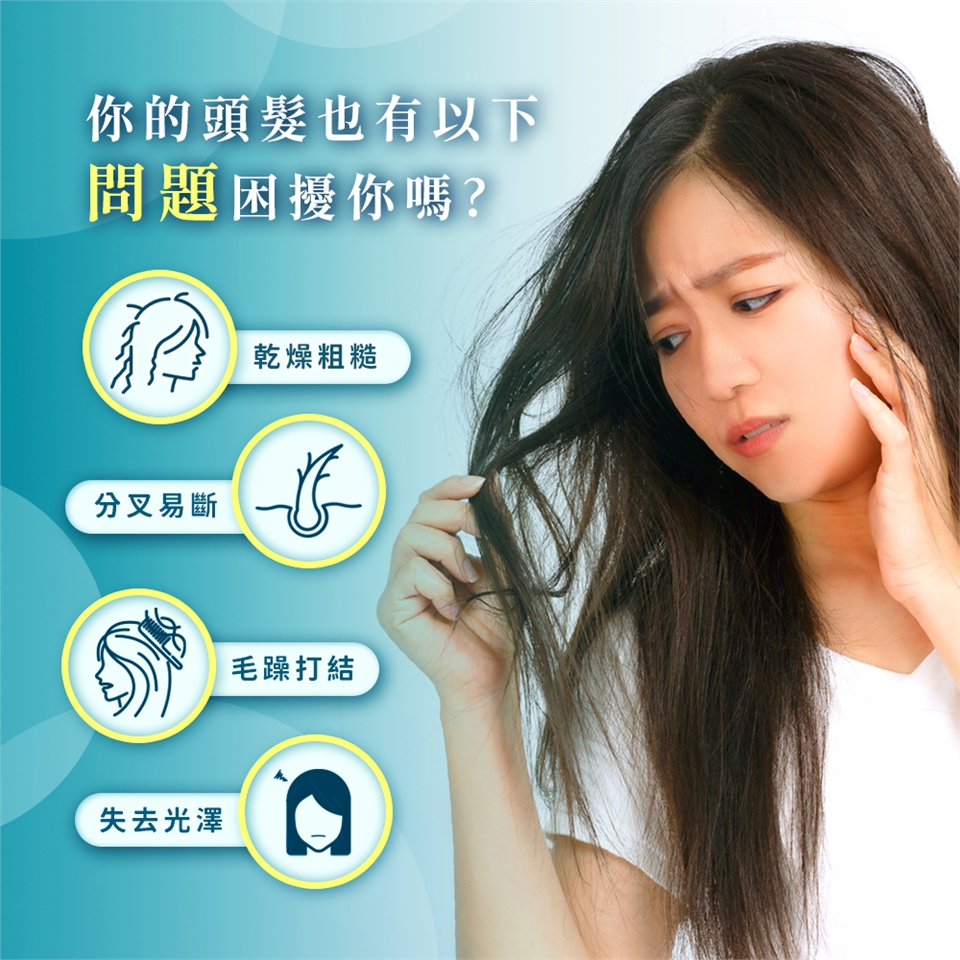 ●「抗靜電水解油角蛋白」有效緩解角質層毛燥、易打結受損髮質,深入髮芯填補空洞,集中撫平護色。