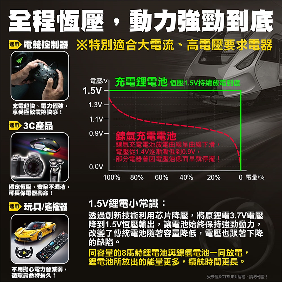 8馬赫鋰電池適合使用大電流要求的電器產品,恆壓電池電量用完前電力並不會減弱。可充達1500次並無記憶效應,也不會漏液並不含鉛汞的環保安全電池可安心使用。