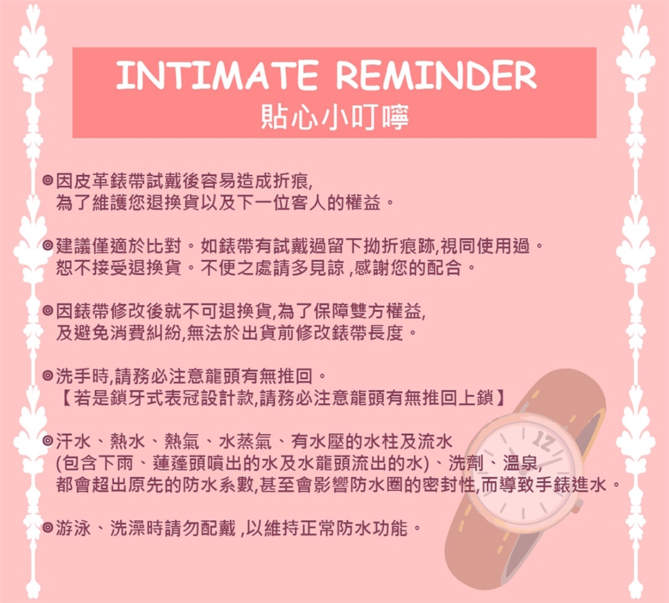 ※非人為因素保固一年(如有碰撞、外拆、摔落、刮傷、進水、進沙、清洗、發霉、外修、佩戴、其他鐘錶行維修等等不在保固範圍內)