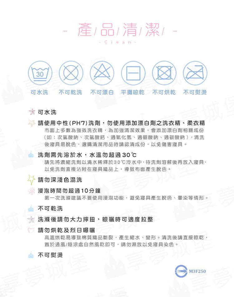 .冷水洗、可乾洗、勿烘乾、勿漂白、中溫熨燙、反面洗滌、深淺布料勿混洗、使用中性清潔劑。