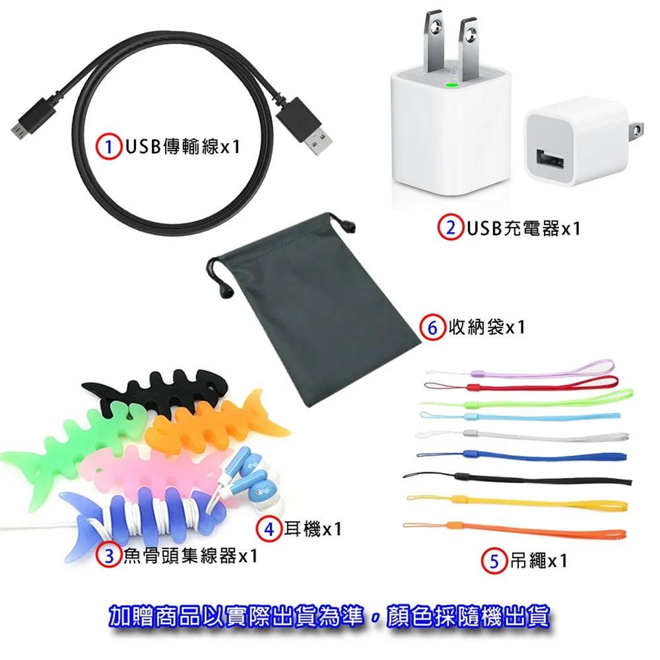 6大好禮: 充電器x1, USB傳輸線x1, 耳機 x1, 收納袋x1, 魚骨頭集線器x1, 吊繩x1
