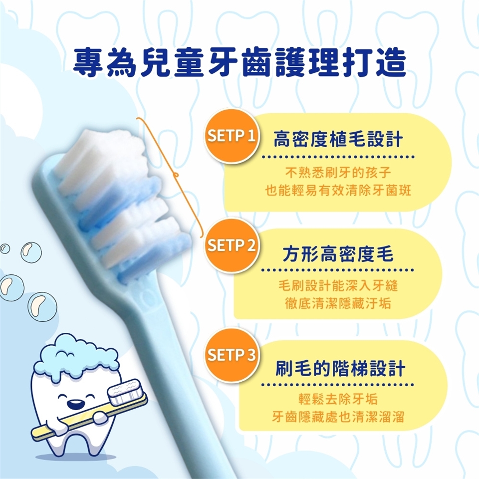 ★採用階梯式高密度植絨工法,即使乳牙階段的牙齒間隙較寬也能輕鬆刷除食物殘渣及牙垢。