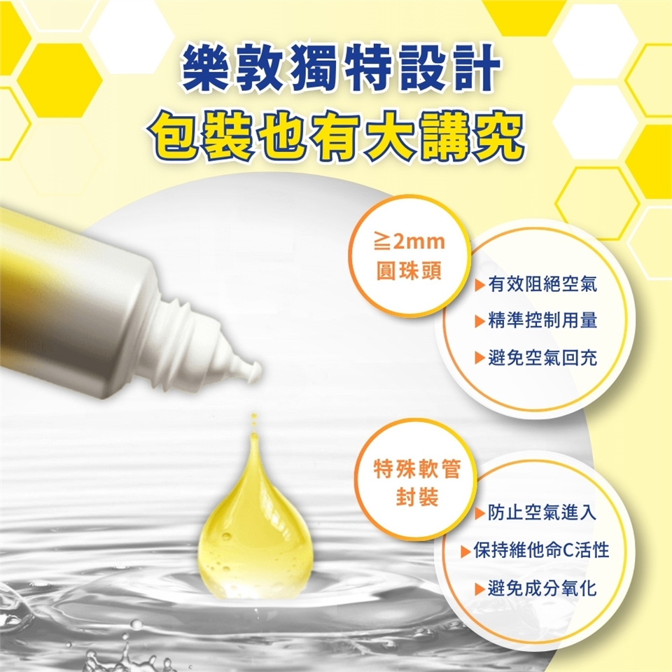 ●獨特包裝設計,採用特殊軟管封裝,搭配小於2mm的圓珠頭,有效阻絕空氣,確保維他命C的活性穩定與長效。