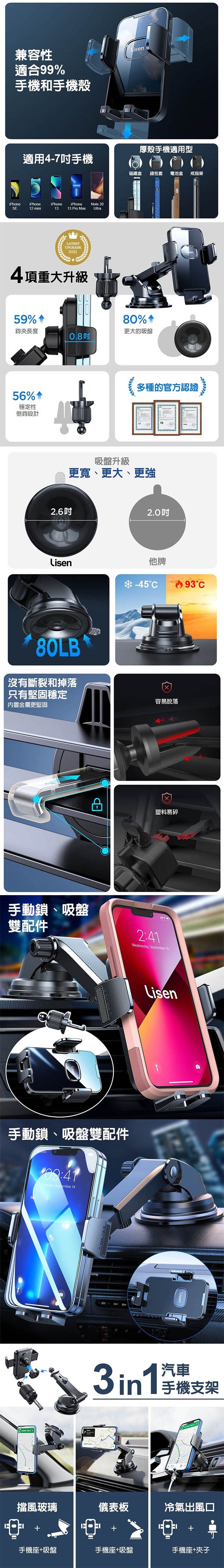 【Lisen】3in1手動鎖吸盤雙配件車用手機支架(適用4~7吋手機)