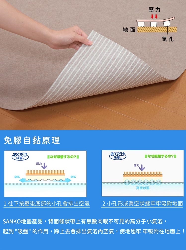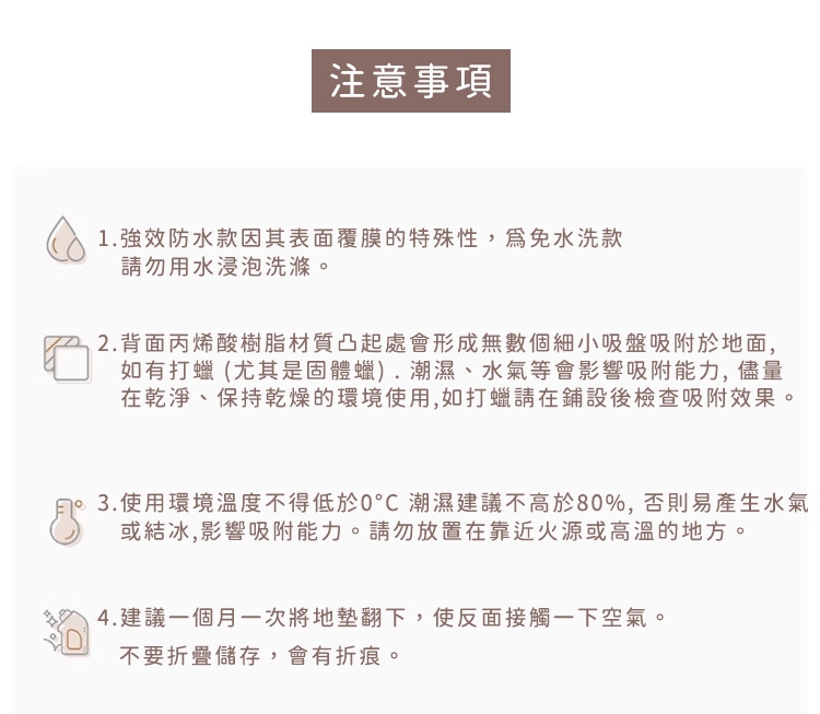 7.背面丙烯酸樹脂材質凸起處會形成無數個細小吸盤吸附於地面,如有打蠟(尤其是固體蠟)、潮濕、水氣等會影響吸附能力,儘量在乾淨、保持乾燥的環境使用,如打蠟請在鋪設後檢查吸附效果。